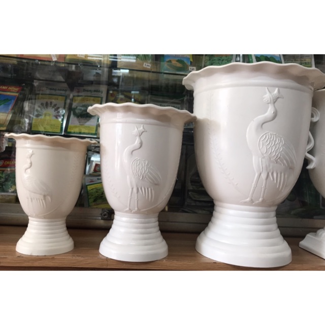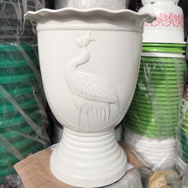 Chậu nhựa có chân khắc hình con cò. Miệng chậu thiết kế lượn sóng, chân có vòng trònChậu đúc dày dặn, cứng cáp. Chất nhựa tốt