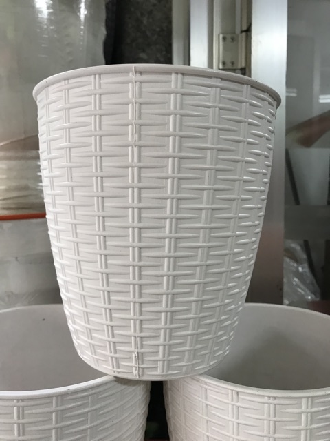 Chậu nhựa kiểu giả đan mây tròn, chất liệu nhựa nguyên, tốt, không pha, không ố màu khi dùng lâu.Đường kính miệng 17 cm
