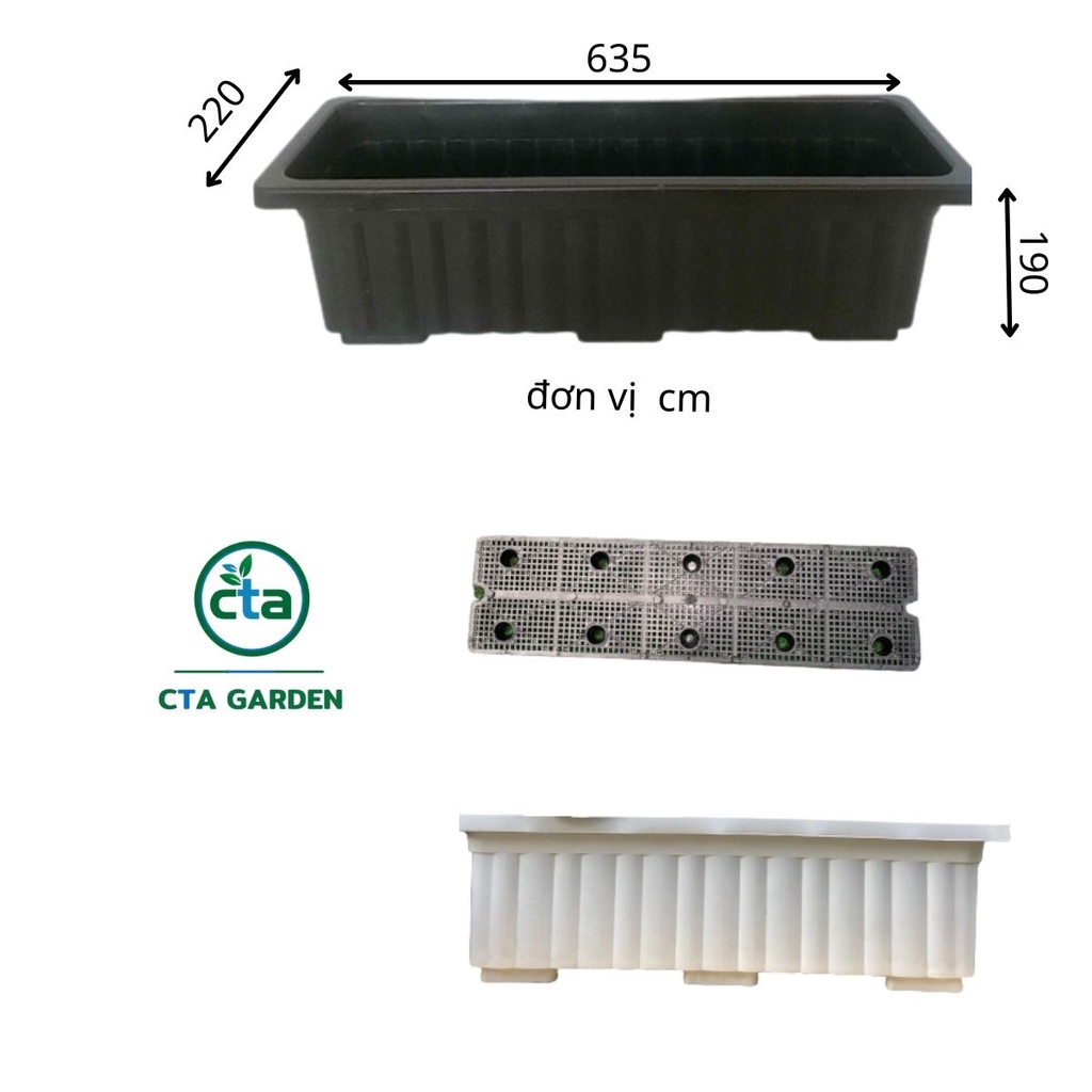 Chậu nhựa kích thước 635 x 220 x 190 (mm) chuyên dùng trồng rau -trồng cây và hoa –thoát nước tốt, chống ngập úng.Chậu được làm bằng chất liệu nhựa PP với 2 tông màu: trắng và đen. Nhựa PP có độ bóng bề mặt tốt, với khả năng chống thấm nước và thấm khí, không dễ bị oxy hóa - nhẹ, cứng cáp, bền, không độc hại