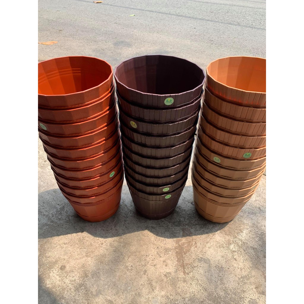 - Chậu Tròn Giống Thùng Gỗ Chuyên trồng cây trang tri để bàn.