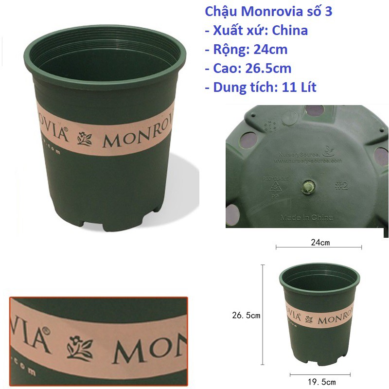 Sản phẩm nhập. Duy nhất màu xanh với dòng chữ và logo Monrovia bản quyền sắc nét. Rất thích hợp làm quà tặng đẳng cấp, sang trọng. Đặc điểm thú vị nhất của chậu nhập Monrovia là trồng bất cứ loại cây nào cũng hợp và mang lại cảm hứng tuyệt vời cho người làm vườn trên toàn thế giới. Có lỗ thoát nước. Chất liệu: nhựa.