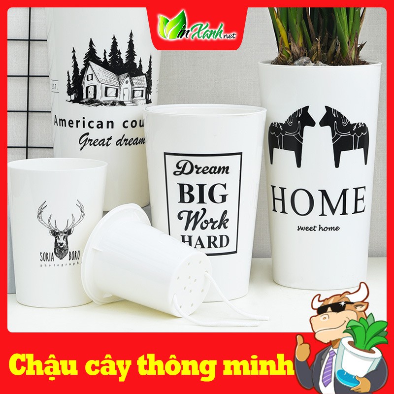 Chậu nhựa trồng cây cao KÈM DÂY tự tưới tự dưỡng thông minh nhựa cao cấp 2 lớp in hình độc đáo