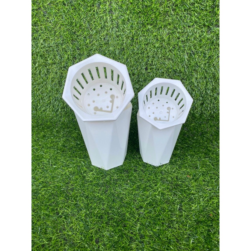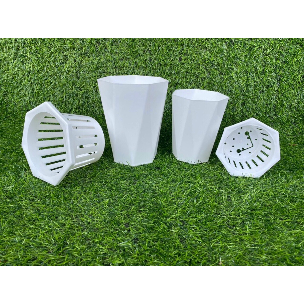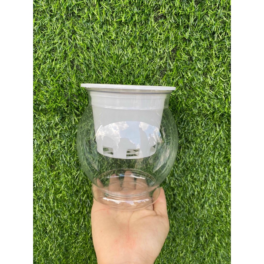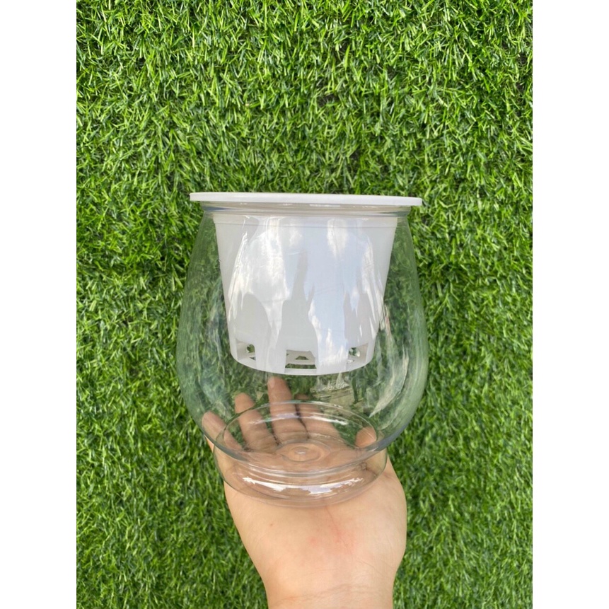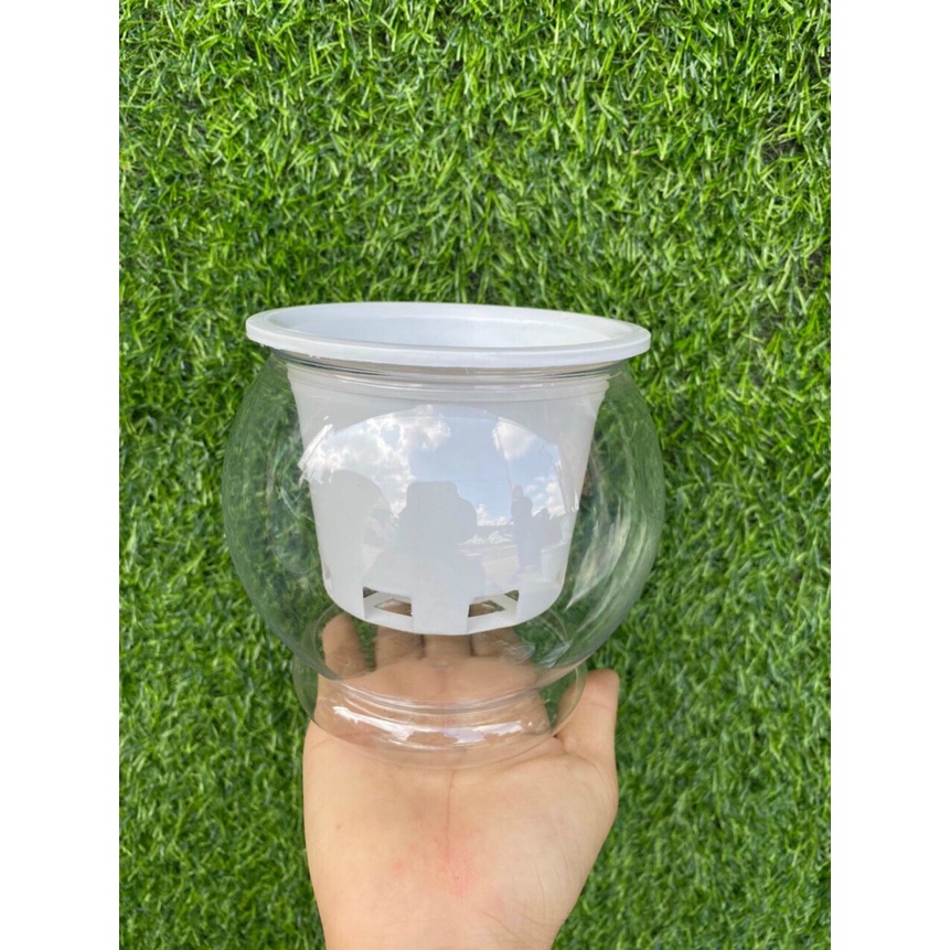 ☘️Chậu làm bằng nhựa trắng, trong, mềm, kín đấy để cho nước vào thả cây , kích thước chậu miệng trên 10cm và cao 17cm, và bên trong gồm 1 chiếc giỏ đỡ bằng nhựa kích thước là rộng 8cmx cao 8cm để đặt cây vào.