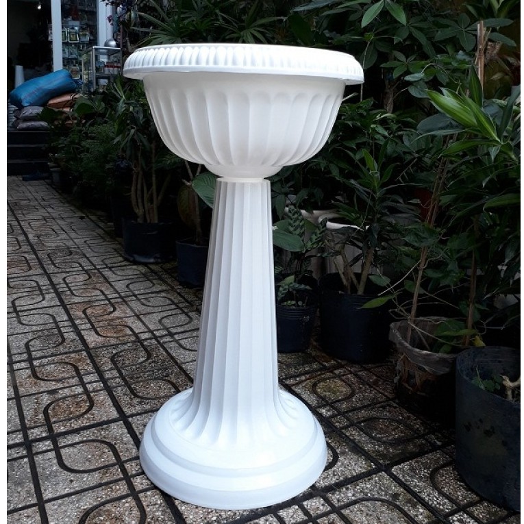 Chậu ly nhựa có chân đế, với màu trắng tinh khôi cùng họa tiết theo phong cách cổ điển ấn tượng; trên chậu và chân đế gân sọc, thích hợp trồng nhiều loại cây nội ngoại thất; mang đến vẻ đẹp sang trọng, kiêu sa đậm chất Châu Âu., với kiểu dáng vô cùng sang trọng rất phù hợp để trồng các loại cây hoa cảnh, cây hoa rủ… như: dừa cạn, dạ yến thảo, tùng thơm…