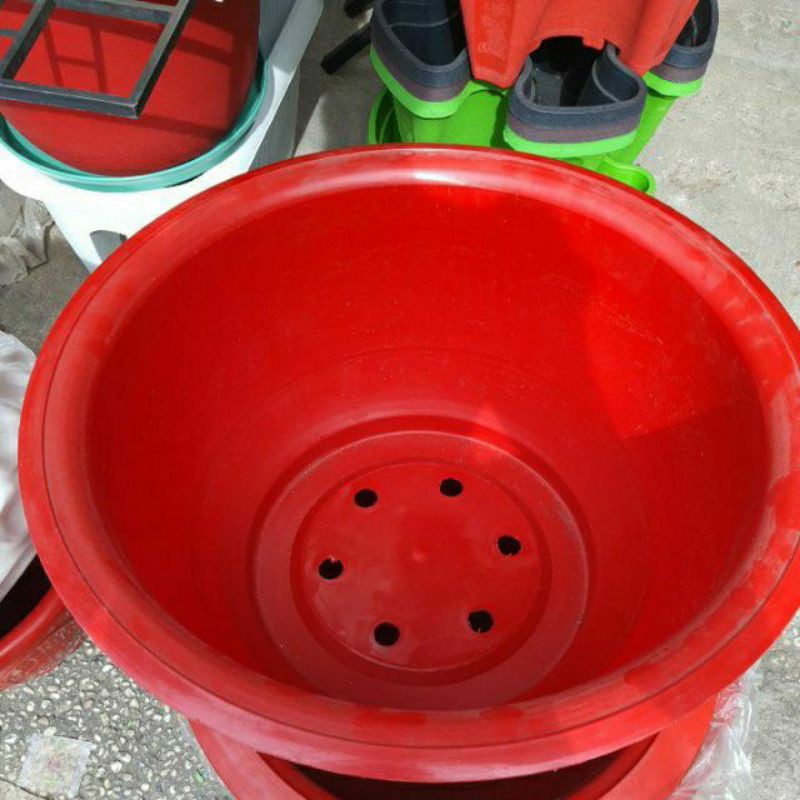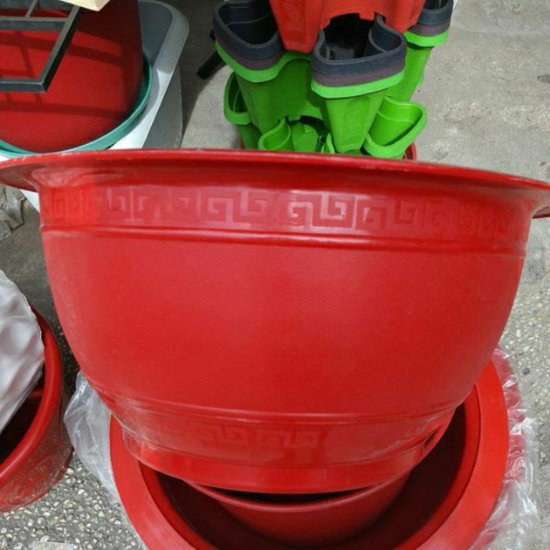 chậu nhựa kiểu truyền thống.đường kính chậu 58cm, tính luôn vành. chậu cao 27cm. màu đỏ như hình.