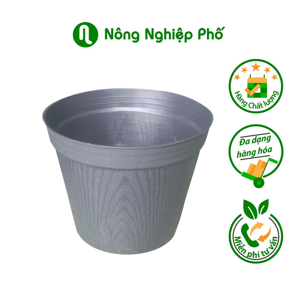 Chậu nhựa vân gỗMô tả: Chậu nhựa vân gỗ là loại chậu được sản xuất từ chất liệu nhựa bền, thiết kế theo miệng tròn cơ bản với bề mặt in nổi họa tiết vân gỗ tạo điểm nhấn hơn khi trồng các loại hoa, cây kiểng mini, để bàn, phòng ngủ, phòng khách...