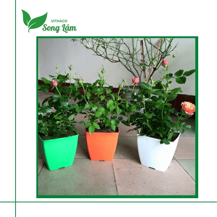 Chậu nhựa vuông có thể dùng trồng hoa hồng, hoa kiểng, cây cảnh trang trí nội thất hoặc ngoại thất như xếp tạo hàng rào dọc lối đi, đặt vào khung treo chậu trên ban công... làm tăng thêm vẻ đẹp cho sân vườn, ngôi nhà của bạn.