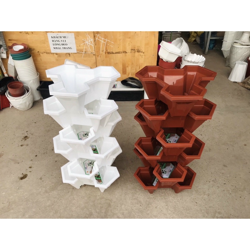 - Chậu trồng xếp tầng giúp tiết kiệm diện tích, phù hợp trồng rau ăn lá, hoa tiểu cảnh các loại