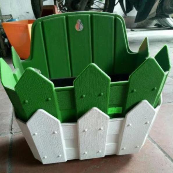 Chậu ốp tường hàng rào giá rẻ nhiều màuMẫu chậu ốp tường hay hàng rào loại này có kích thước vừa phải chuyên dùng để trang trí ban công chung cư.