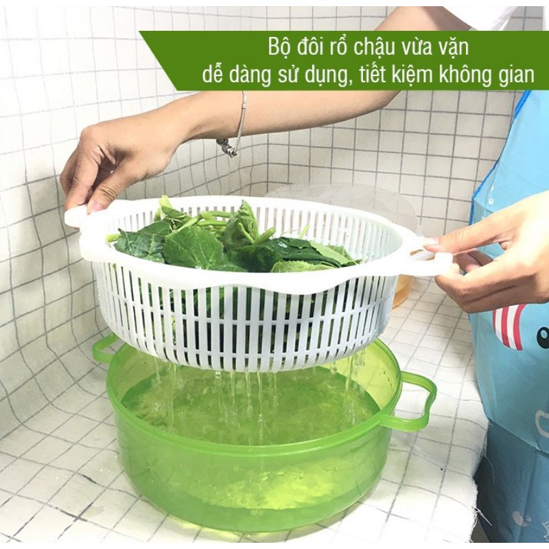Với thiết kế thông minh Bộ rổ chậu tròn có nắp đậy gồm 3 món: chậu, rổ, nắp đậy nên có công dụng rất đa dạng khi sử dụng. Bạn vừa có thể rửa, làm ráo thực phẩm vừa có thể dùng nắp đậy để bảo quản, giữ cho thực phẩm luôn xanh tươi
