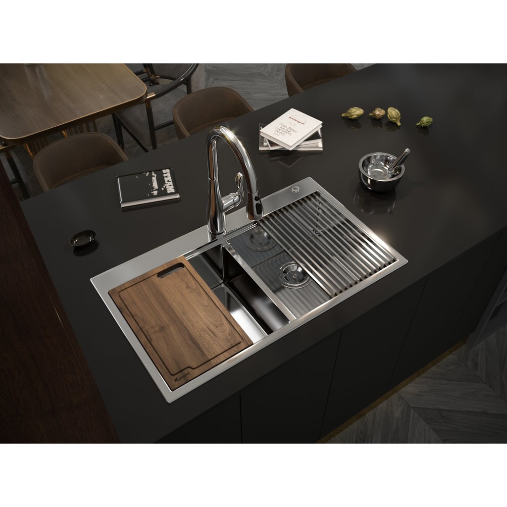 Model KN8250TD thuộc bộ sưu tập sản phẩm Topmount Series của Konox. Chậu được sản xuất theo công nghệ bán thủ công với độ dày lớn, hố chậu to và sâu giúp tăng thêm diện tích thao tác. Chậu được thiết kế một hố to một hố bé giúp người dùng linh hoạt trong việc lựa chọn hố để thao tác rửa tiết kiệm nước và hiệu quả hơn. Điểm khác biệt ấn tượng của Model KN8250TD là thiết kế hạ bậc giúp tích hợp thớt gỗ và các phụ kiện, cho phép người dùng thao tác thái cắt đồ nấu ngay trên mặt chậu, tạo nên trải nghiệm mới lạ và tiện ích độc đáo. Model KN8250TD phù hợp cho khoang tủ bếp 800mm và là sự lựa chọn đáng tiền đối với gian bếp hiện đại.