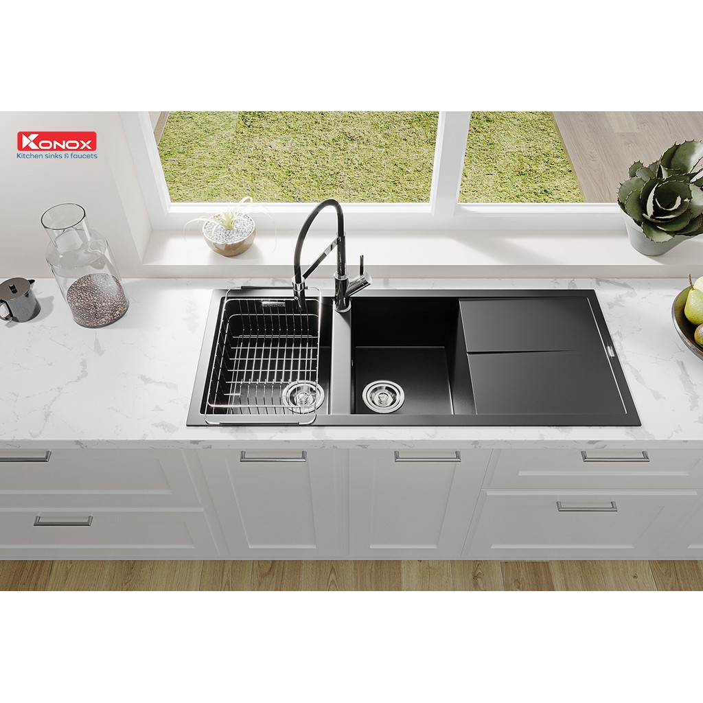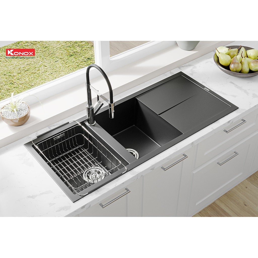 Chậu rửa bát đá KONOX Granite Series Livello 1160 Black, Made in Italy, Full set gồm Siphon + Giá úp bát inox