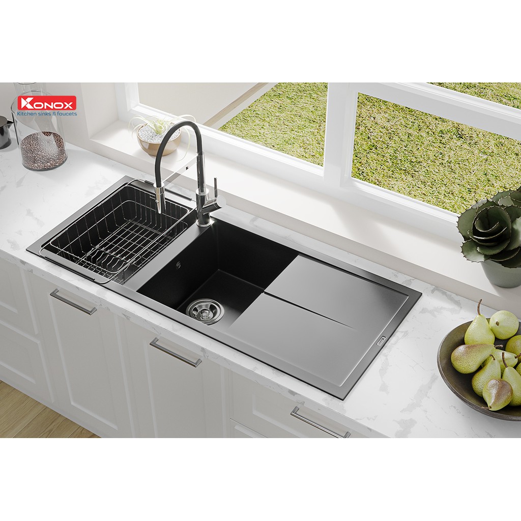 Giới thiệu Chậu rửa bát đá KONOX Granite Series Livello 1160 Black, Made in Italy, Full set gồm Siphon + Giá úp bát inox