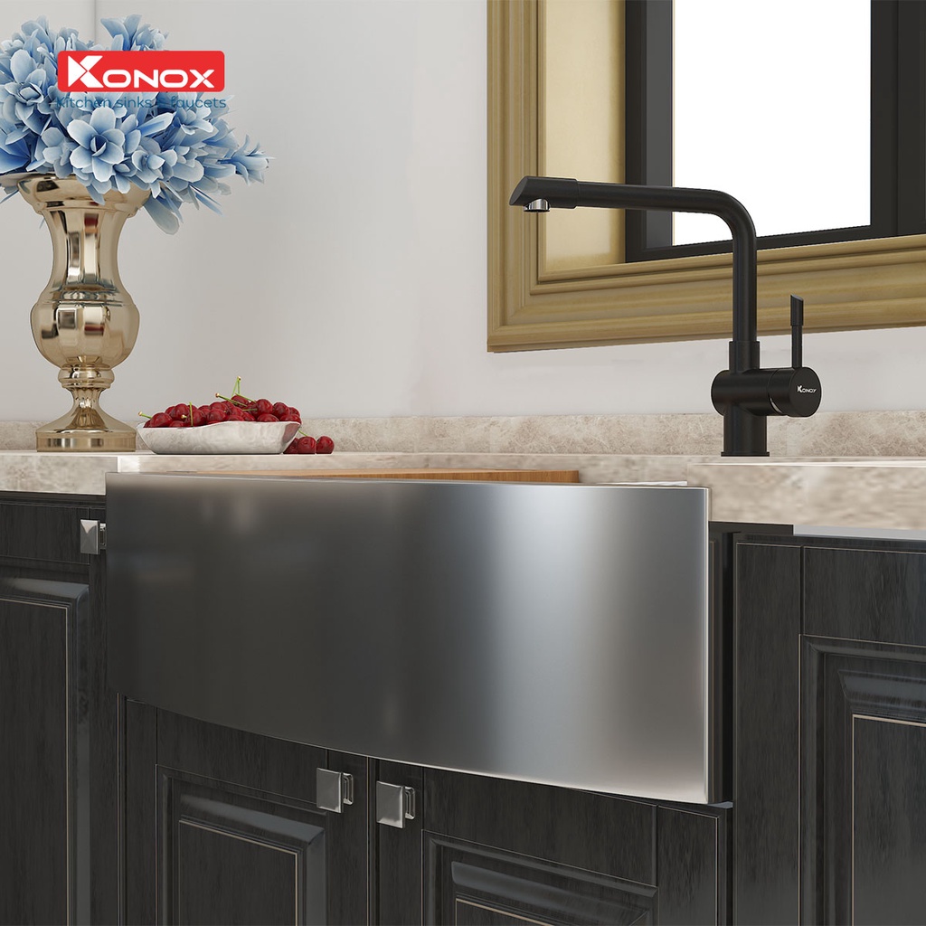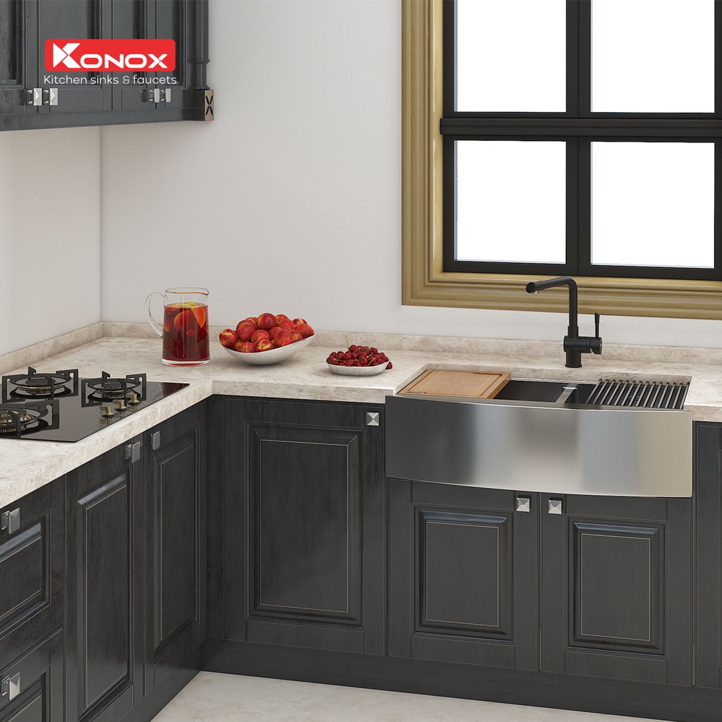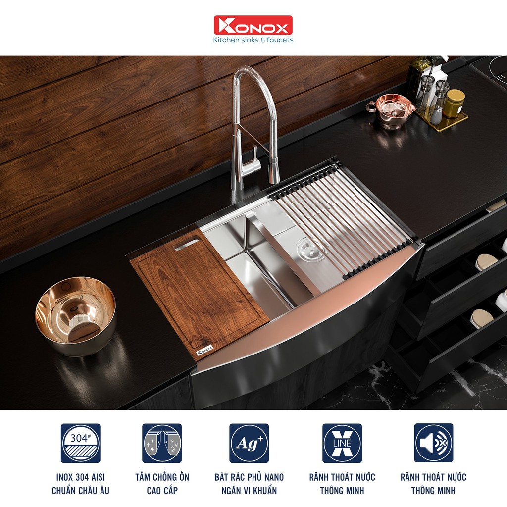 Apron Sinks hay còn gọi Farmhouse sinks là dòng sản phẩm thiết kế tạo điểm nhấn trong không gian bếp đang được sử dụng phổ biến tại thị trường Mỹ và EU, sản phẩm ngoài chức năng của chậu rửa còn hướng tới một góc nhìn độc lạ về thiết kế phô diễn, Model Apron KN8450DA còn được Konox tích hợp công năng nhờ công nghệ thủ công tạo gờ hai bên cho phép tích hợp các phụ kiện đi kèm giúp ích cho người dùng trải nghiệm thao tác nhanh gọn ngay trên mặt chậu. Tại Việt Nam dòng sản phẩm này chưa được phát triển phổ biến và hứa hẹn sẽ mang đến góc nhìn mới về chậu rửa bát.