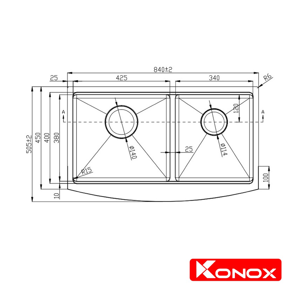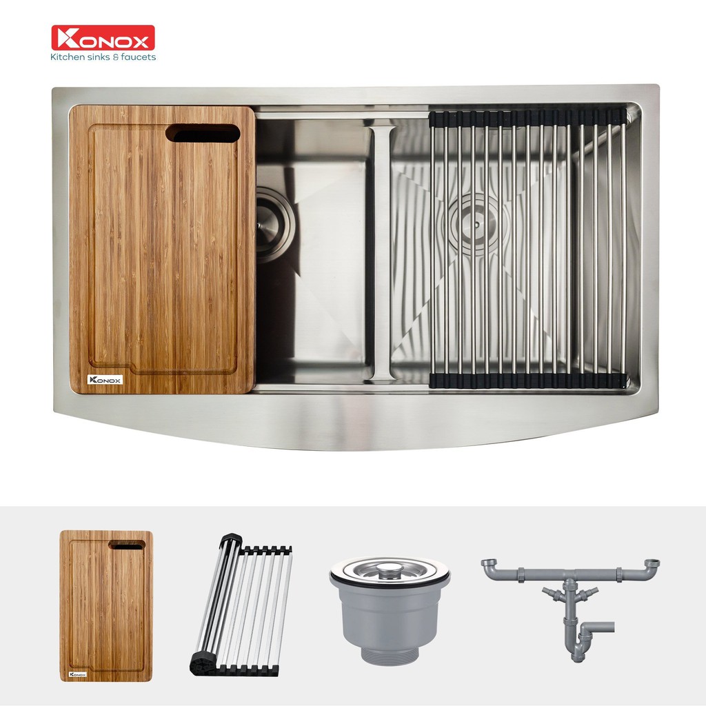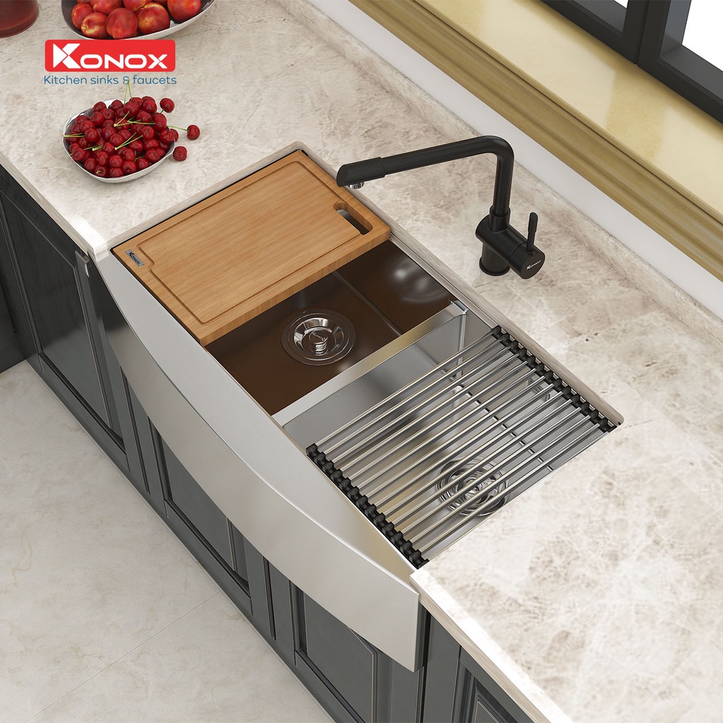 Apron Sinks hay còn gọi Farmhouse sinks là dòng sản phẩm thiết kế tạo điểm nhấn trong không gian bếp đang được sử dụng phổ biến tại thị trường Mỹ và EU, sản phẩm ngoài chức năng của chậu rửa còn hướng tới một góc nhìn độc lạ về thiết kế phô diễn, Model Apron KN8450DA còn được Konox tích hợp công năng nhờ công nghệ thủ công tạo gờ hai bên cho phép tích hợp các phụ kiện đi kèm giúp ích cho người dùng trải nghiệm thao tác nhanh gọn ngay trên mặt chậu. Tại Việt Nam dòng sản phẩm này chưa được phát triển phổ biến và hứa hẹn sẽ mang đến góc nhìn mới về chậu rửa bát.