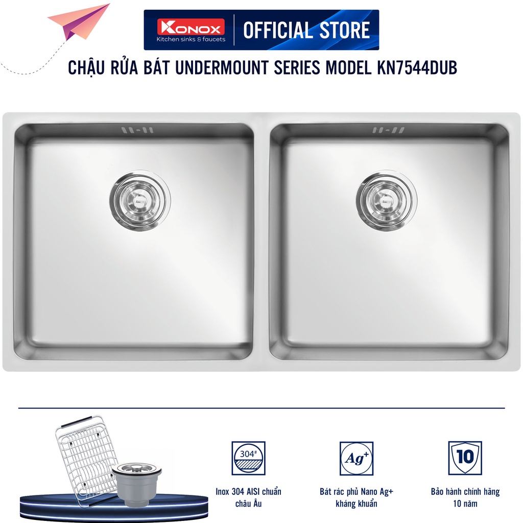 Nhà cửa & Đời sống > Dụng cụ & Thiết bị tiện ích > Chậu rửa & vòi nước || Chậu rửa bát inox KONOX Undermount Series KN7544DUB, inox 304AISI, full set gồm Siphon+Giá úp bát inoxCòn hàng