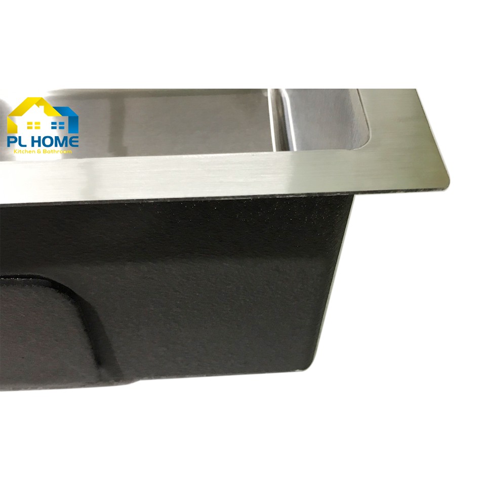 Chậu rửa bát làm từ inox SUS 304 sẽ sáng bóng, dày, bề ngoài chậu được sơn 1 lớp cách ồn màu đen quanh chậu nên khi rửa bán đĩa sẽ không nghe tiếng kêu ổn từ nước xả hay tiếng bát đĩa va vào thành chậu. Lớp sơn màu đen này còn có tác dụng chống axit ăn mòn trong môi trường nước phèn