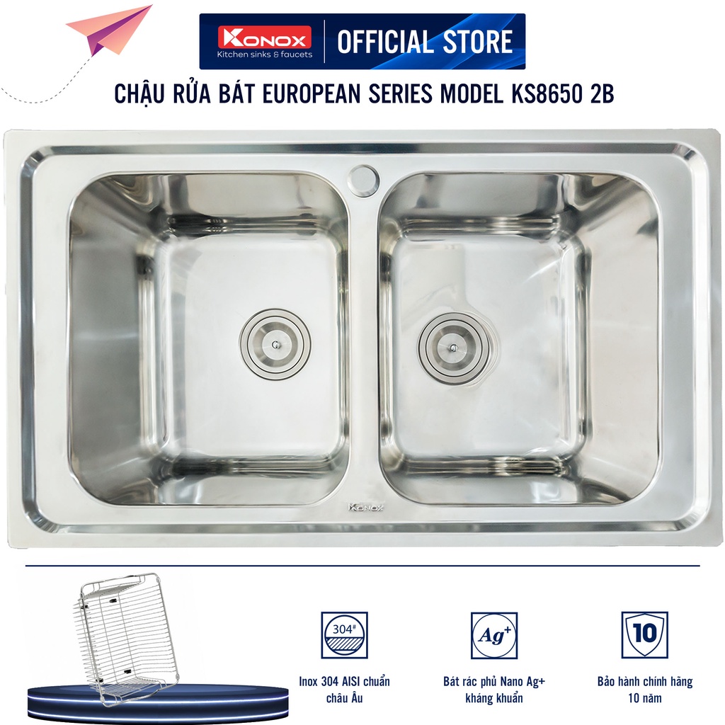 Chậu rửa bát KONOX European Premium KS8650 2B, inox 304AISI, full set gồm Siphon+Giá úp bát inox