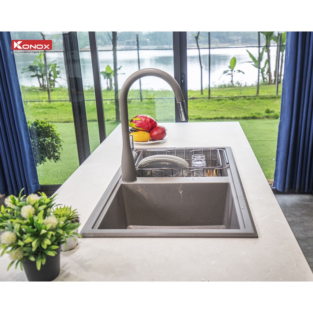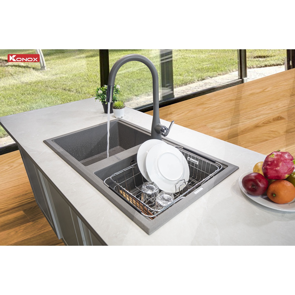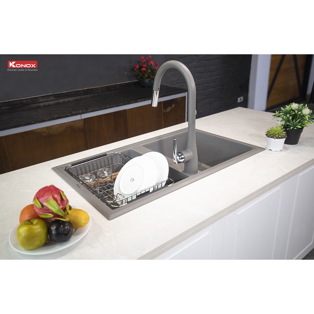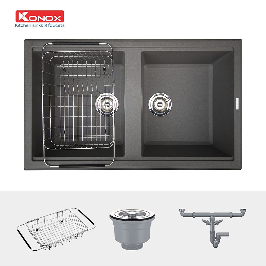 Nhà cửa & Đời sống > Dụng cụ & Thiết bị tiện ích > Chậu rửa & vòi nước || Chậu rửa bát KONOX Granite Series Phoenix 860 Grey, Made in Italy, Full set gồm Siphon + Giá úp bát inoxCòn hàng