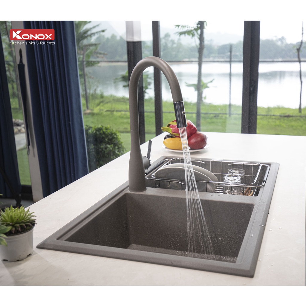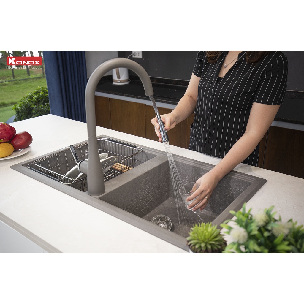 Giới thiệu Chậu rửa bát KONOX Granite Series Phoenix 860 Grey, Made in Italy, Full set gồm Siphon + Giá úp bát inox