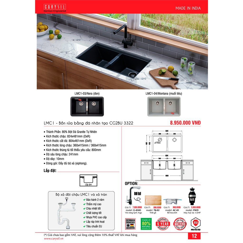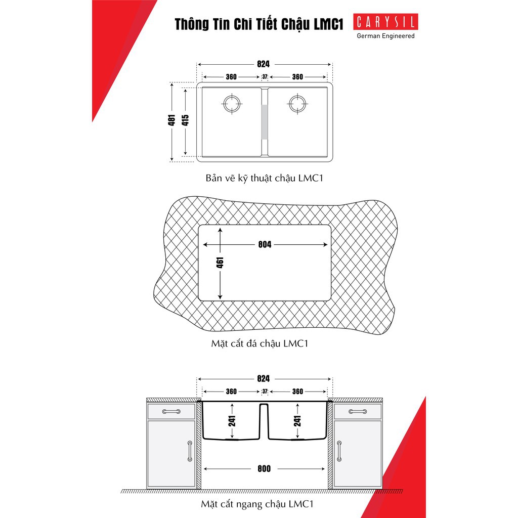 CARYSIL - Chậu Rửa Chén Bằng Đá Chuyên Gắn Âm Mặt Đá - LMC1-03 - Màu Đen - 824x481mmThông Tin Kỹ Thuật Chậu Rửa Chén Đá Granite Carysil LMC1-03 - Màu Đen - 824x481mm