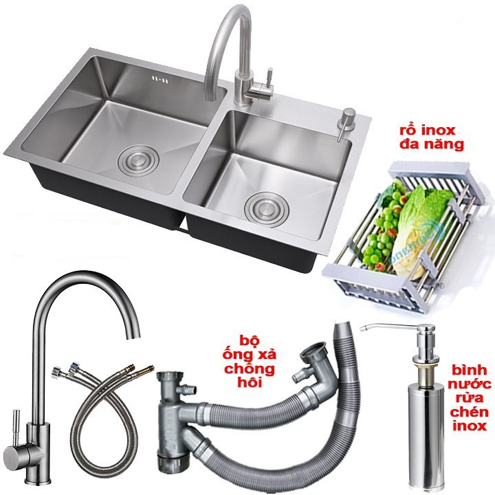 +5 sản phẩm : Chậu + xả + Rổ đa năng + Bình xả bông inox + vòi rửa chén nóng lạnh fi24 ( Tặng kèm dây cấp )