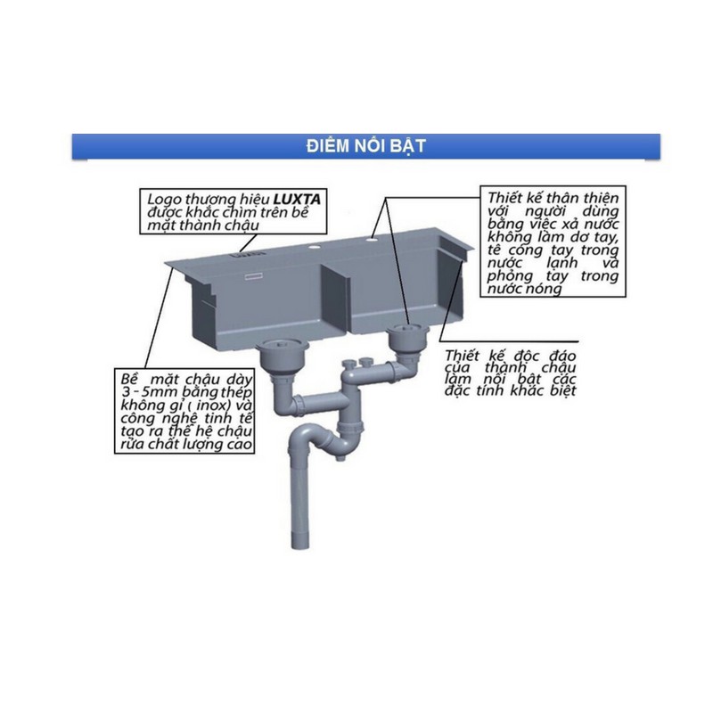 Chậu rửa chén cao cấp Luxta inox304 LC8046-3.0, chậu dày 3mm, chống ồn, bảo hành 05 năm>Kiểu dáng sang trọng, Inox 304 dày 3mm