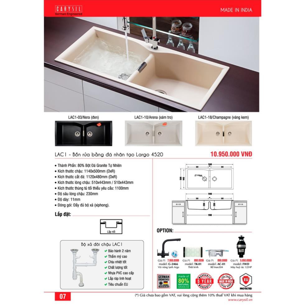 Giới thiệu Chậu Rửa Chén CARYSIL Bằng Đá Granite 2 Hố Lớn LAC1-18 Vàng Kem/Champagne 1140x500mm