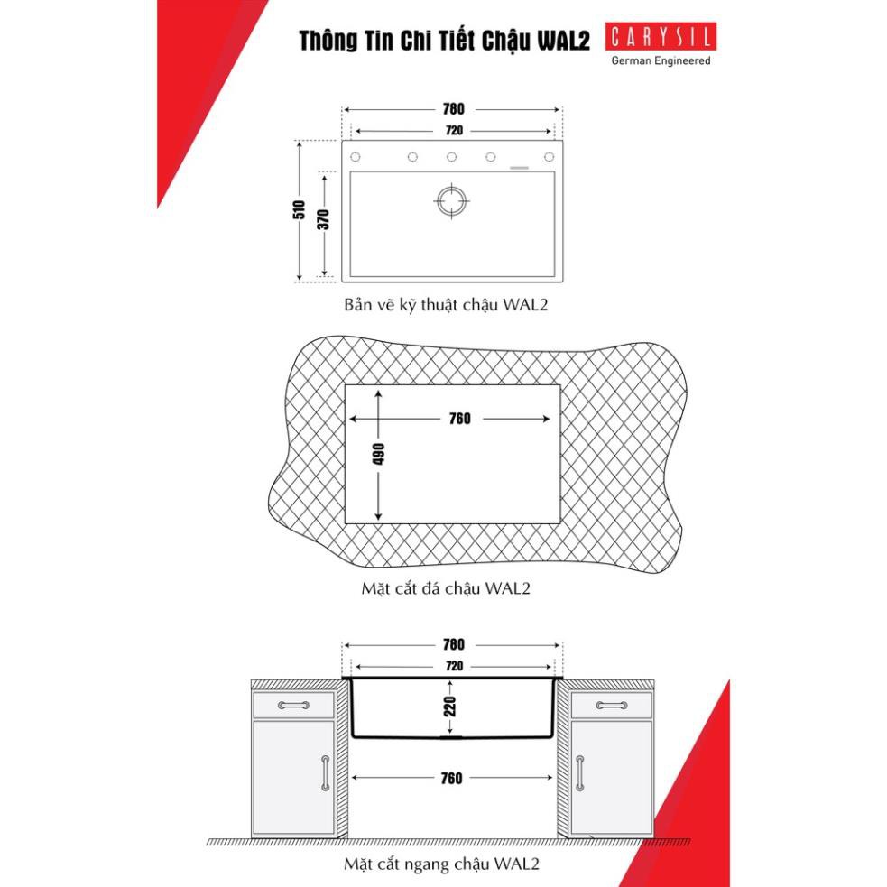 CARYSIL - Chậu Rửa Chén Bằng Đá Hố Đơn Loại Lớn - WAL2-02 - Màu Trắng - 780x510mmThông Tin Kỹ Thuật Chậu Rửa Chén Đá Granite Carysil WAL2-02 - Màu Trắng - 780x510mm