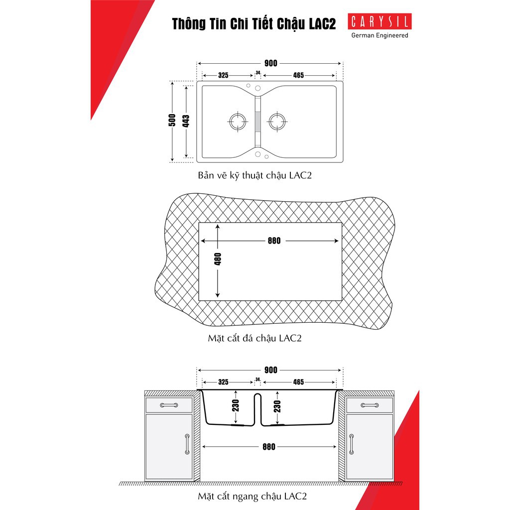 CARYSIL - Chậu Rửa Chén Bằng Đá Granite 2 Hố Lệch - LAC2-01 - Màu Muối Ớt/ Cornflakes - 900x500mmThông Tin Kỹ Thuật Chậu Rửa Chén Đá Granite Carysil LAC2-01 - Màu Muối Ớt/ Cornflakes - 900x500mm