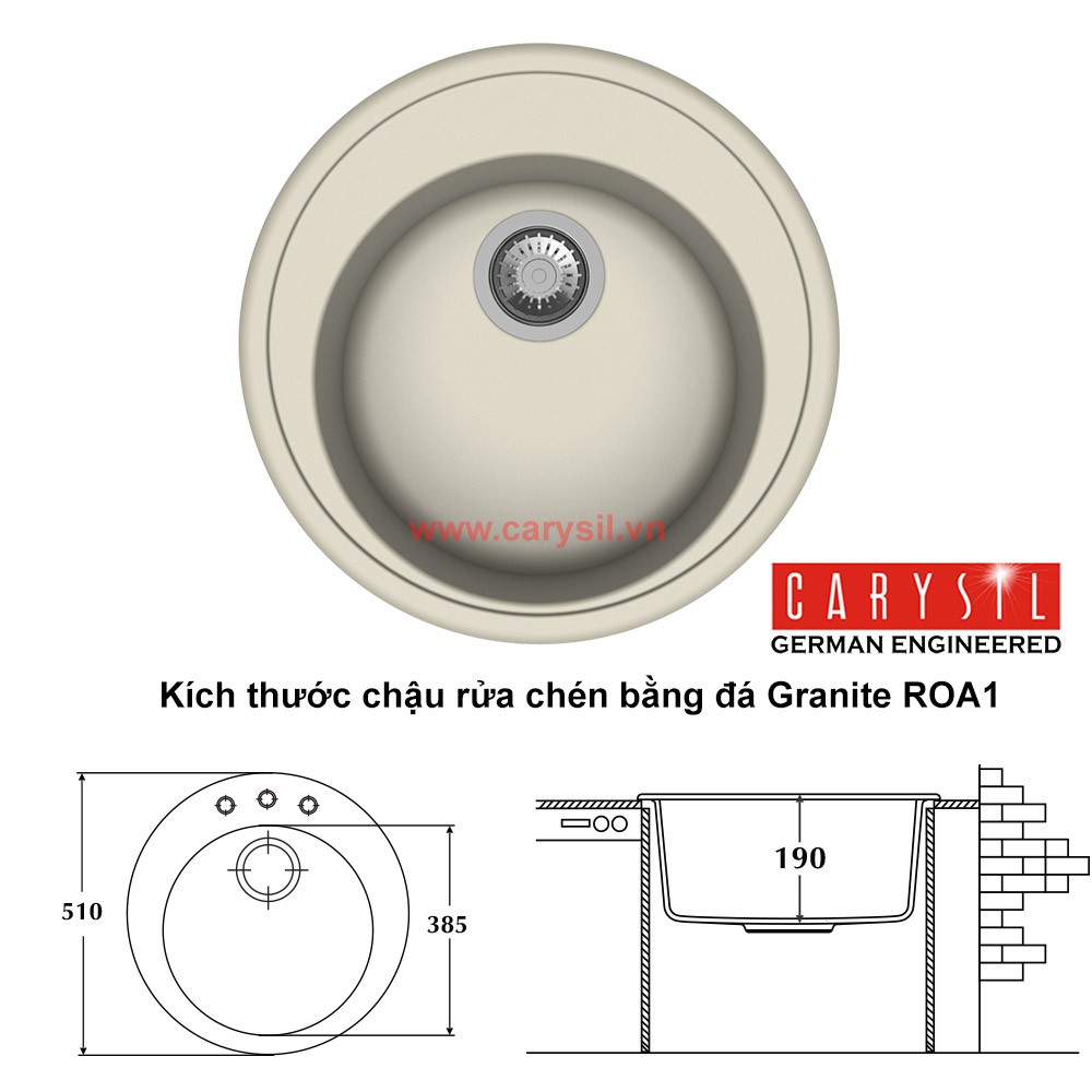 Lưu ý sản phẩm chưa bao gồm vòi chậu rửa chén nóng lạnh .Chậu rửa chén Carysil làm từ bột đá granite ROA1