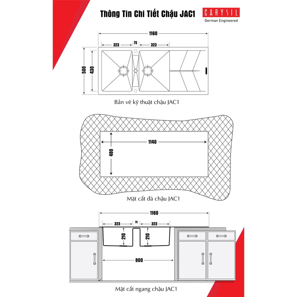 Chậu Rửa Chén Đá Granite Carysil JAC1-03 - Màu Đen - 1160x500mmThông Tin Kỹ Thuật Chậu Rửa Chén Đá Carysil JAC1-03 - Màu Đen - 1160x500mm