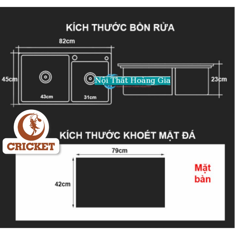 + Chậu rửa chén 2 ngăn kích thước phủ bì Dài x Rộng: 82x45cm (thông số chi tiết có hình ảnh ở bên trên)