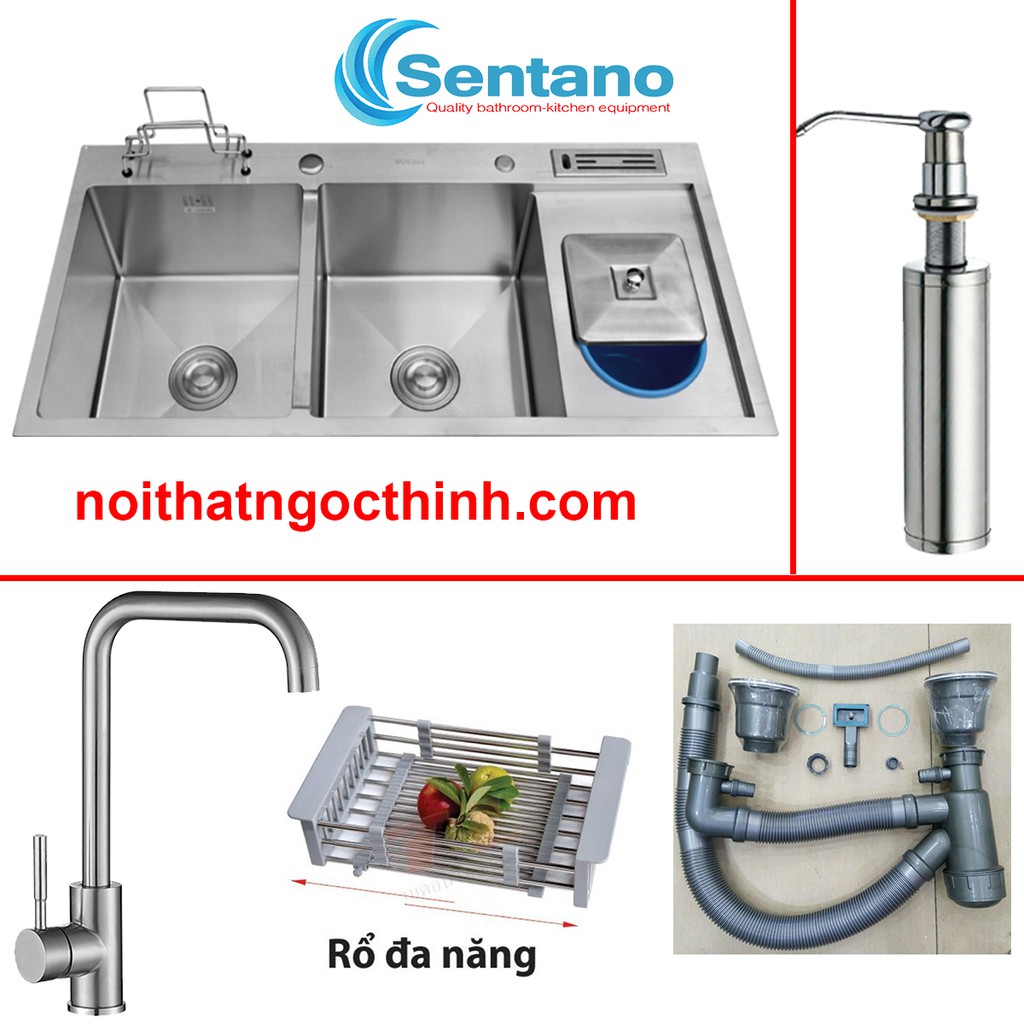 Giới thiệu Chậu rửa chén đúc SENTANO kích thước 100x48cm có kệ dao thớt, hộc rác kèm theo vòi rửa chén, bình xà bông cao cấp