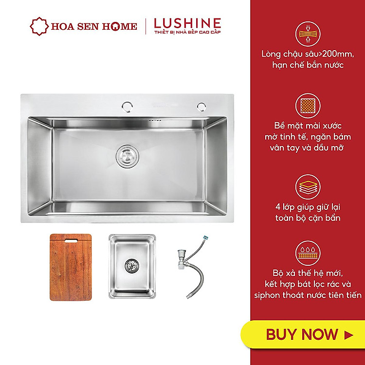 Giới thiệu Bộ chậu rửa chén INOX 304 LUSHINE D004 công nghệ tạo hình thủ công, bề mặt mài xước láng mịn, chống xước bền bỉ - Hoa Sen Home - Hàng chính hãng