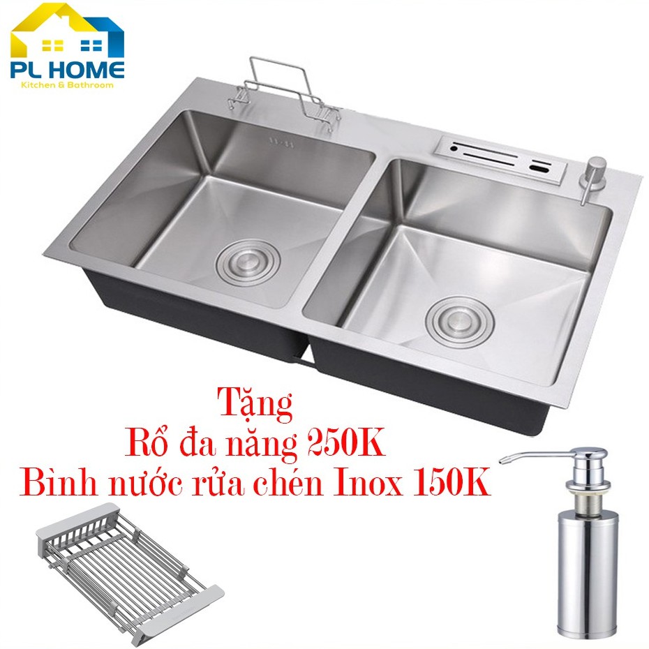 Chậu Rửa Chén Inox SUS 304 đúc 2 hộc kích thước 82x45 – Có chỗ treo thớt – Tặng Rổ Đựng Đa Năng