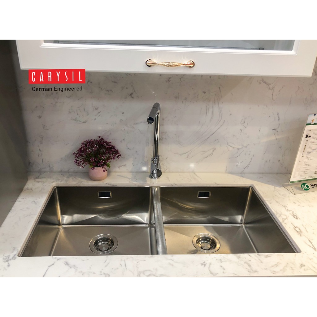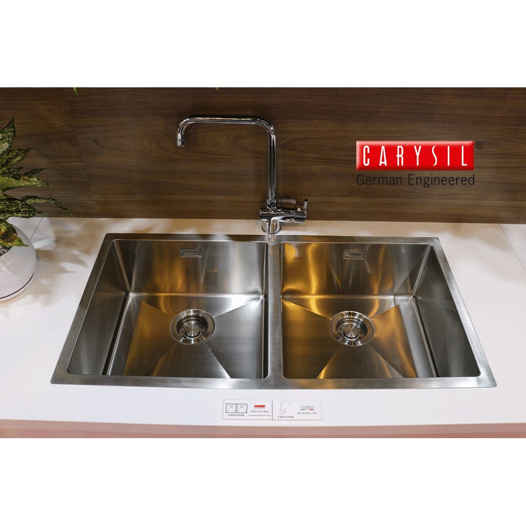Mẫu chậu rửa chén2 hố thiết kế khác biệt của Carysil. Sản phẩm có không gian sử dụng lớn cho phép khách hàng có thể thao tác sử dụng cùng lúc nhiều thứ – như vừa rửa vừa cắt gọt và vừa để khô các dụng cụ mà vẫn thoải mái trong hoạt động nội trợ.