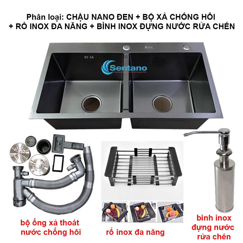 - Phân loại: Chậu rửa chén nano đen 82x25cm 2 ngăn cân SENTANO + bộ xả chống hôi