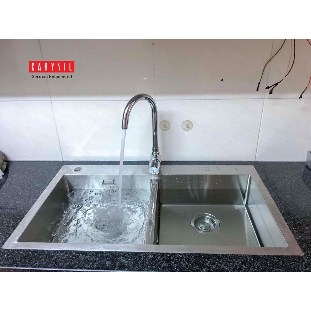 Mẫu chậu rửa chén2 hố thiết kế khác biệt của Carysil. Sản phẩm có không gian sử dụng lớn cho phép khách hàng có thể thao tác sử dụng cùng lúc nhiều thứ – như vừa rửa vừa cắt gọt và vừa để khô các dụng cụ mà vẫn thoải mái trong hoạt động nội trợ.