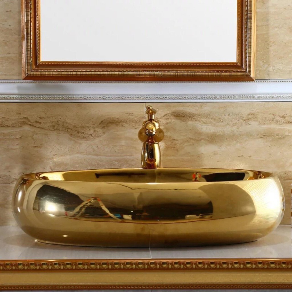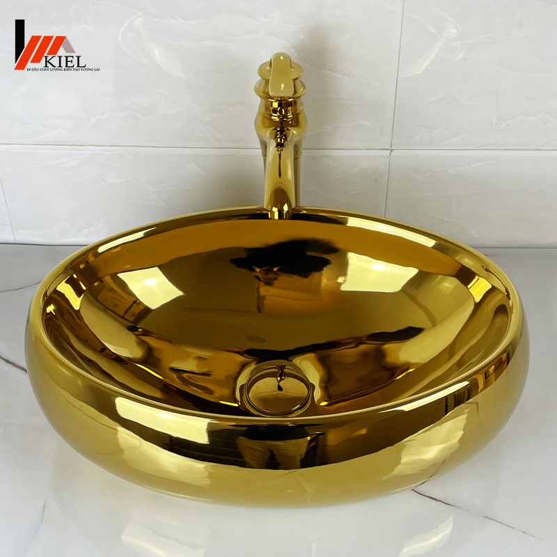 Chậu rửa lavabo elip mạ vàng cực đẹp với độ bền cao thời gian sử dụng trên 20 năm .