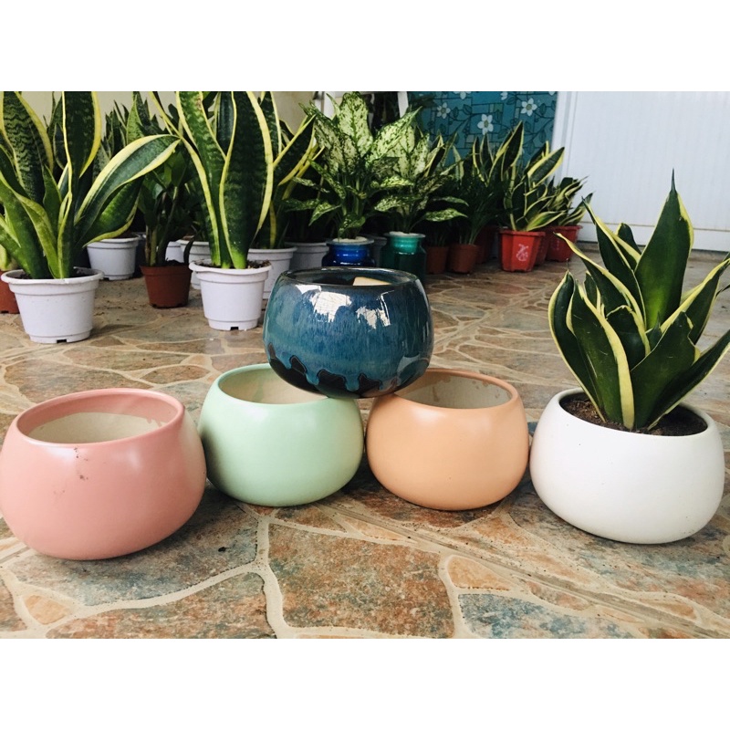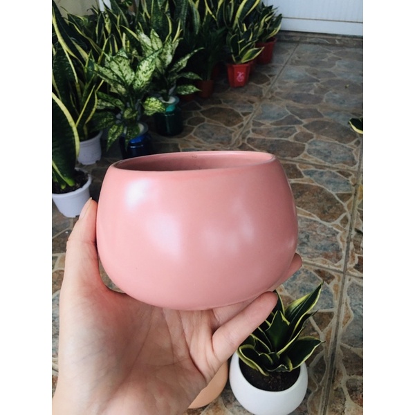 Chậu trơn không in hình, có nhiều màu sắc như: trắng, hồng, cam, đen. Dễ phối hợp với các loại cây cảnh.