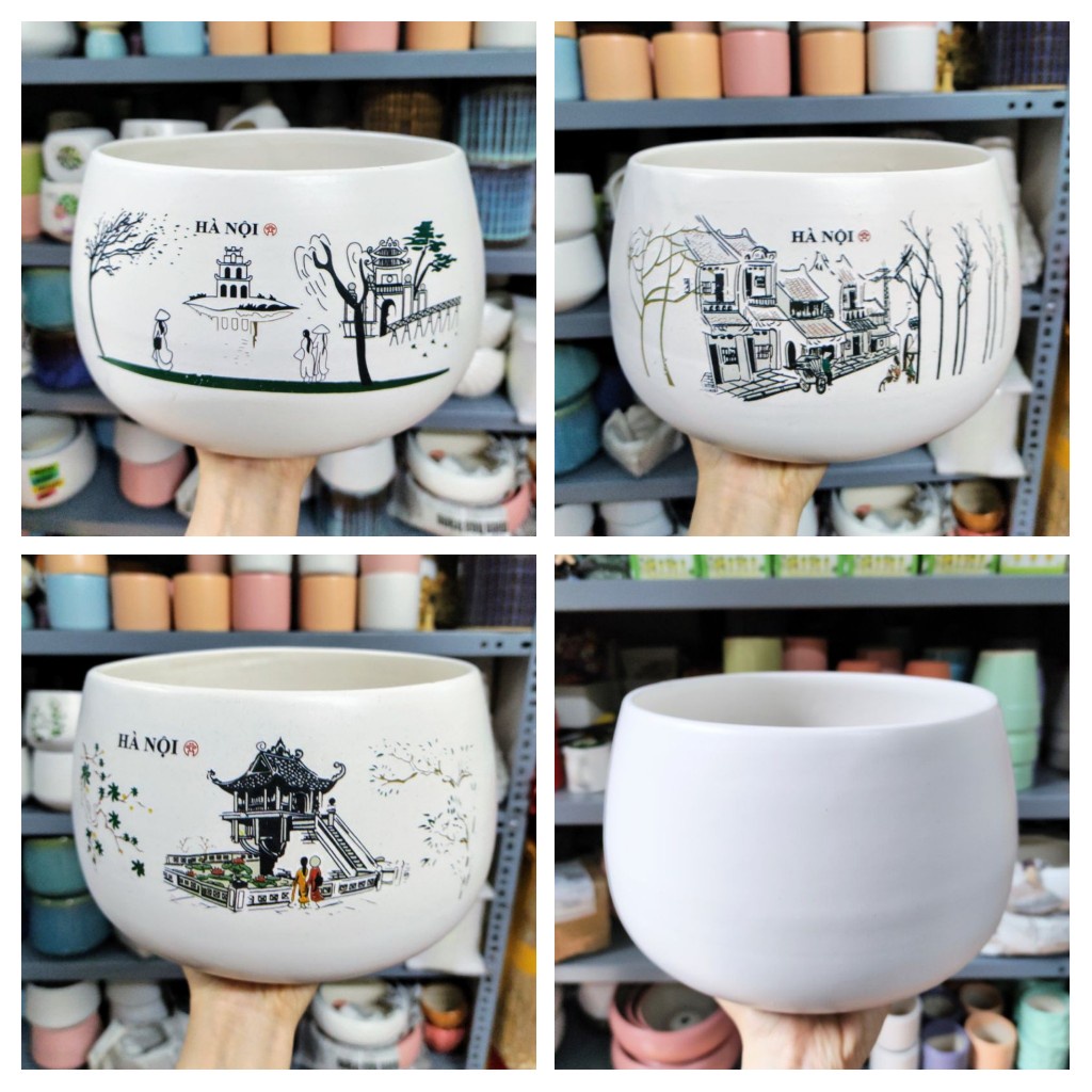 Chậu sứ Bát Tràng đẹp, phủ lớp men trắng có in nhiều hình đẹp (hình giao ngẫu nhiên). Quý khách chọn mẫu vui lòng inbox shop