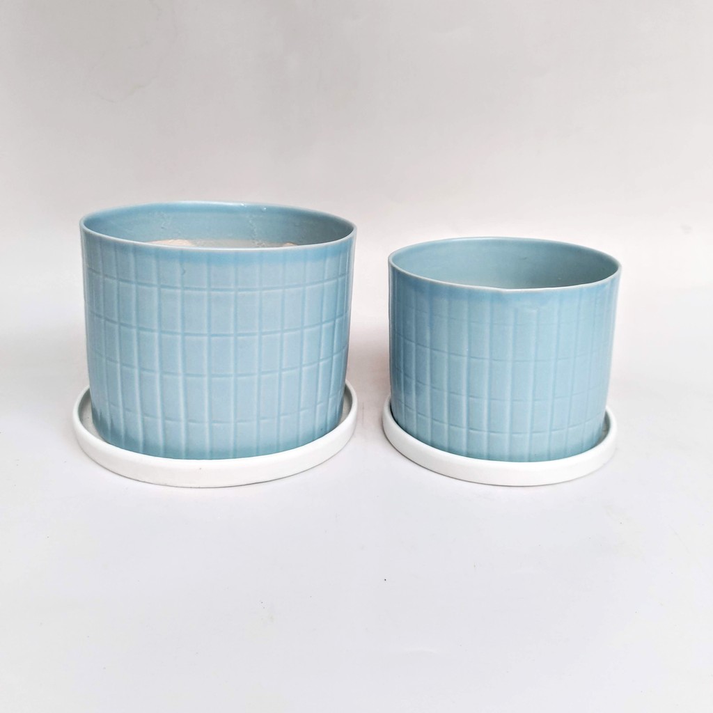 Chậu sứ trồng cây hình trụ, họa tiết gạch caro kèm đĩa hứng nước, men lạnh đẹp
