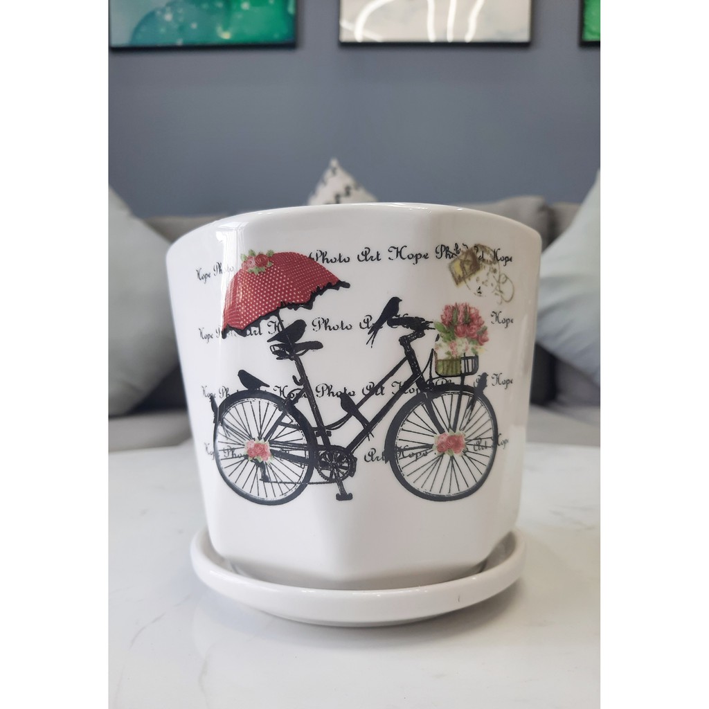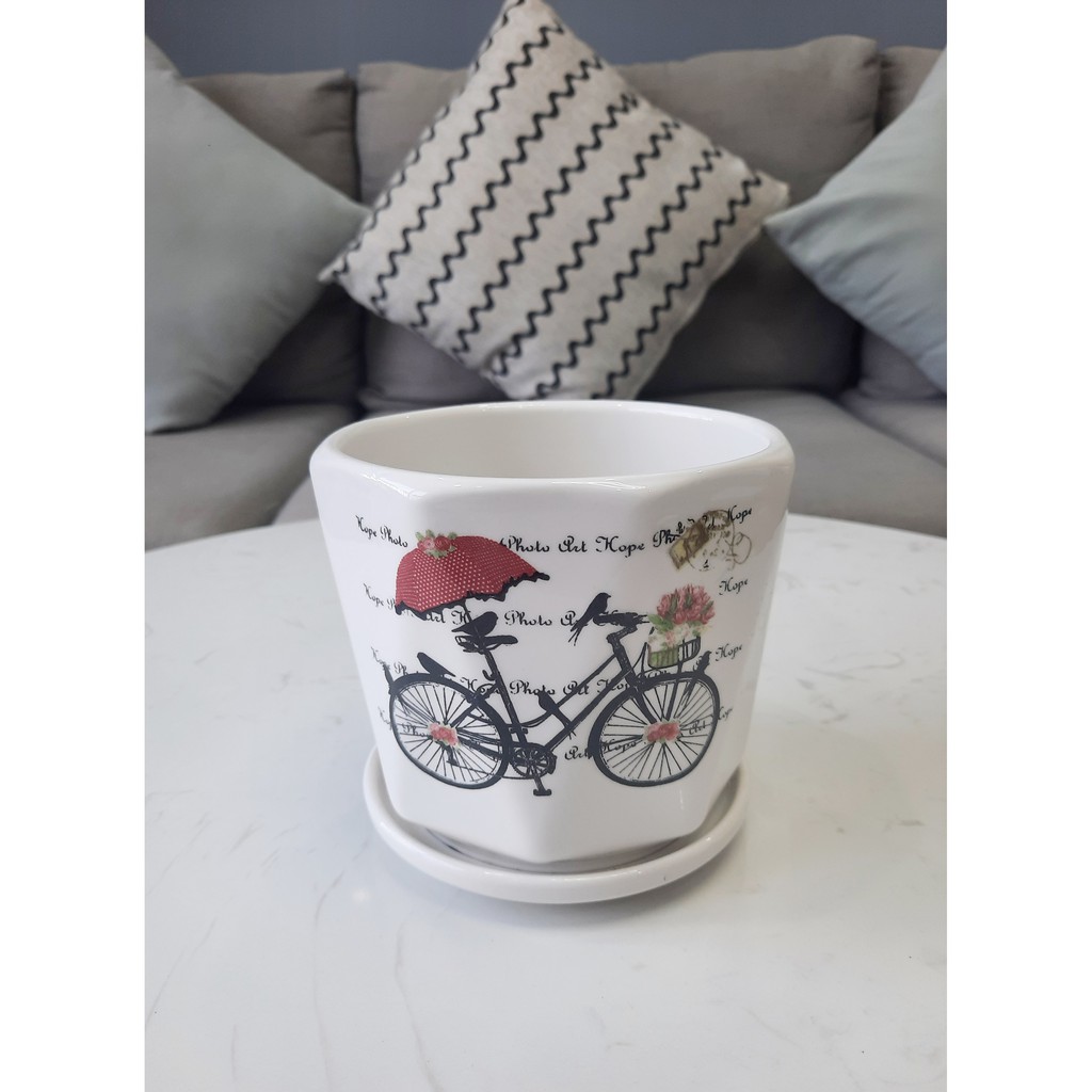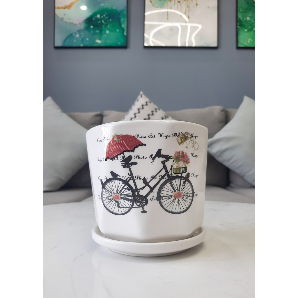 - Màu sắc: chậu gốm sứ màu trắng họa tiết chiếc xe đạp