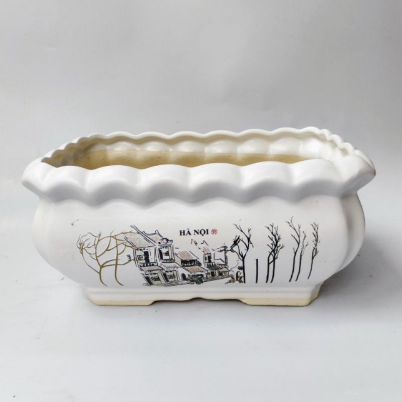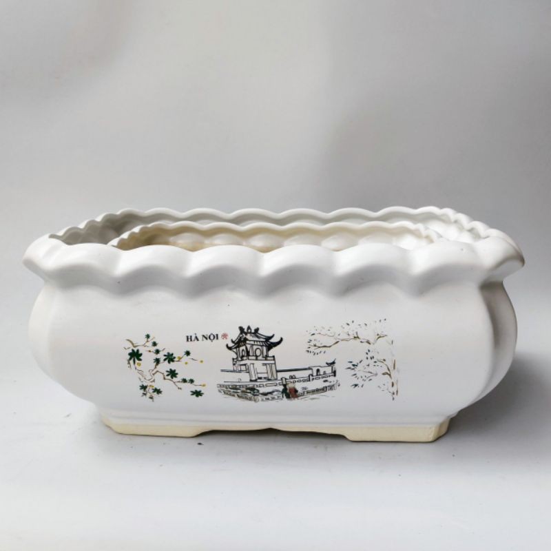 Chậu gốm sứ cao cấp Bát Tràng, được làm từ loại đất trắng và phủ lên mình màu trắng tinh từ loại men mát đặc biệt, tạo cho sản phẩm vẻ đẹp trang nhã. Chậu được in nhiều hình từ danh lam thắng cảnh đến hình hoa lá.