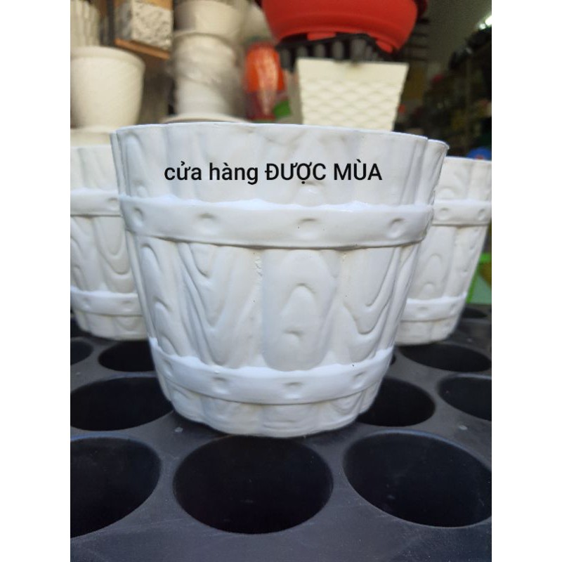 chậu nhựa trồng cây kiểu giả thùng gỗ.đường kính chậu 17cm, cao 14cm. dùng dĩa lót size 17cm của shop.