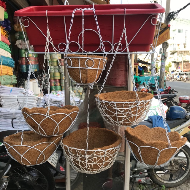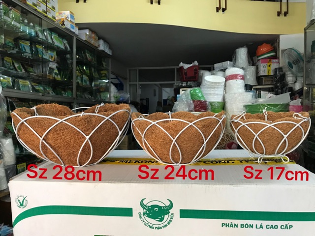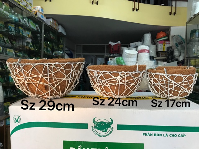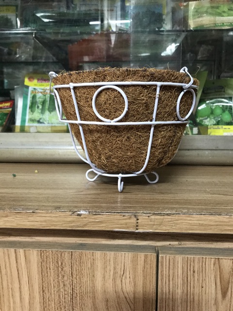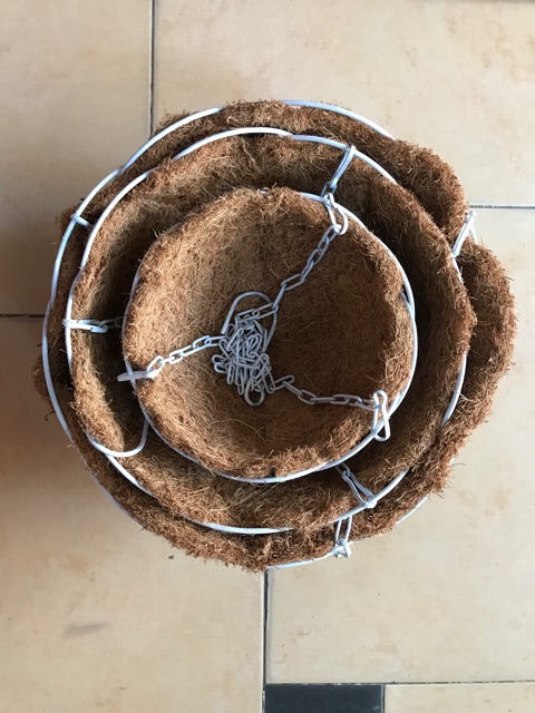 Chậu treo sơ dừa loại nhỏ 17,5 cm. Khung sắc hàn chắc chắn, phun sơn trắng.Dây treo xích bằng sắc chắc chắn, dính liền với chậu. Sơ dừa miếng cắt lót bên trong.