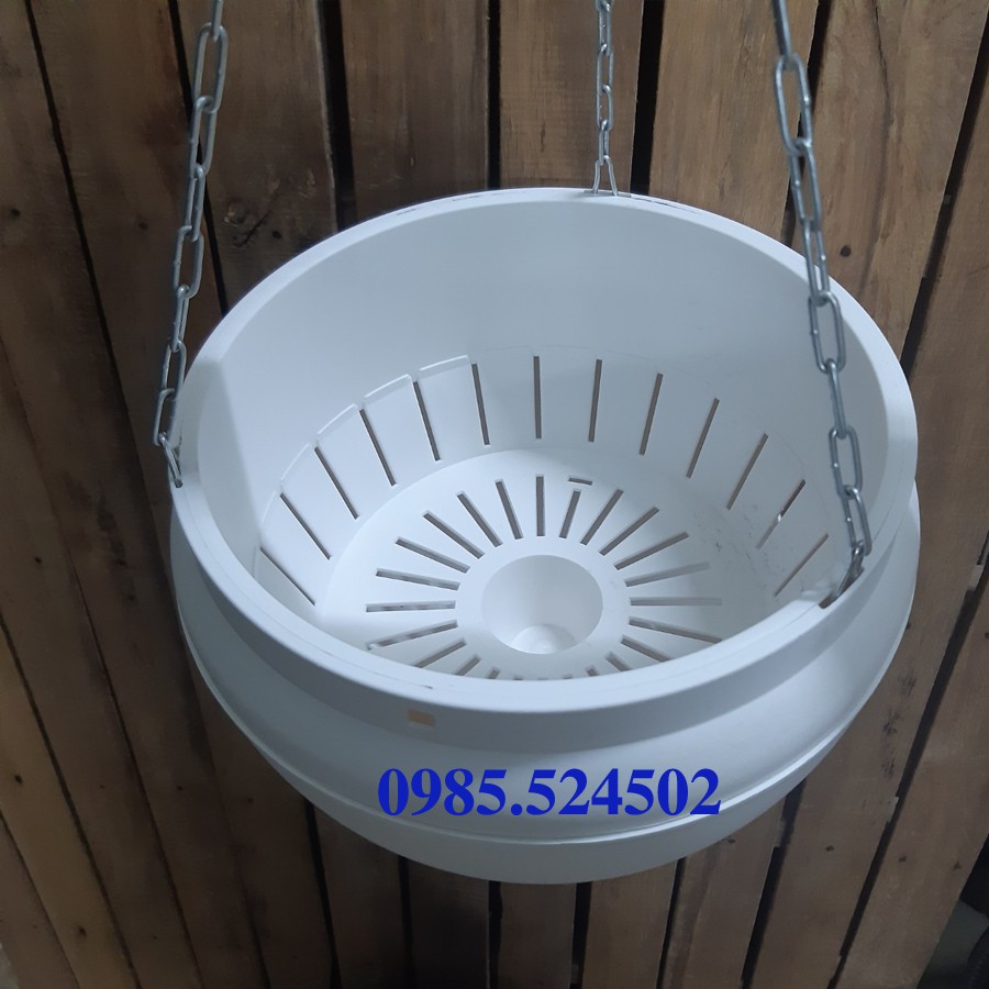 Chậu treo tròn hai đáy kích thước đường kính 24cm x cao 21cmTính năng nổi bật: 1. Lưới nhựa thông minh: Để ngăn cách đất và đáy chậu để nếu tưới nước nhiều quá thì nước sẽ ngấm xuống dưới đáy, ngăn cách với đất khoảng 3 cm nên sẽ không sợ cây bị úng vì tưới nhiều nước. 2. Lỗ thoát nước và lấy oxy thông minh: Cách đáy khoảng 2 cm giúp thoát nước khi gặp lượng mưa nhiều hoặc tưới vượt mức đồng vừa thông thoáng oxy cho cây. Đồng thời sẽ lắng tụ giúp giữ được chất dinh dưỡng bị rửa trôi khi tưới nhiều hoặc mưa nhiều. Nằm phía bên hông giúp chậu vẫn giữ được tính thẩm mỹ. Không như loại chậu thông thường có lỗ dưới đáy chậu khiến đất vương vãi ra ngoài theo nước mà lỗ thông minh này sẽ giữ đất lại.