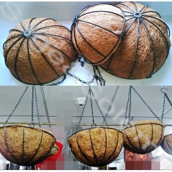 Chậu xơ dừa được thiết kế theo kiểu dáng tổ chim, ngoài sắt có đan nhựa, khung và xích treo sắt được sơn tỉnh điện màu trắng hoặc đen được lót bằng xơ dừa đã qua xử lý và tạo dáng.