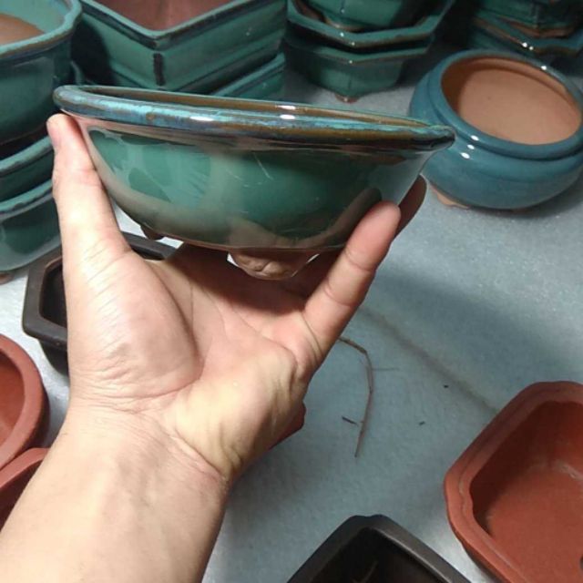 Mô tả sản phẩm.Chậu gốm men xanh, chậu bonsai tròn